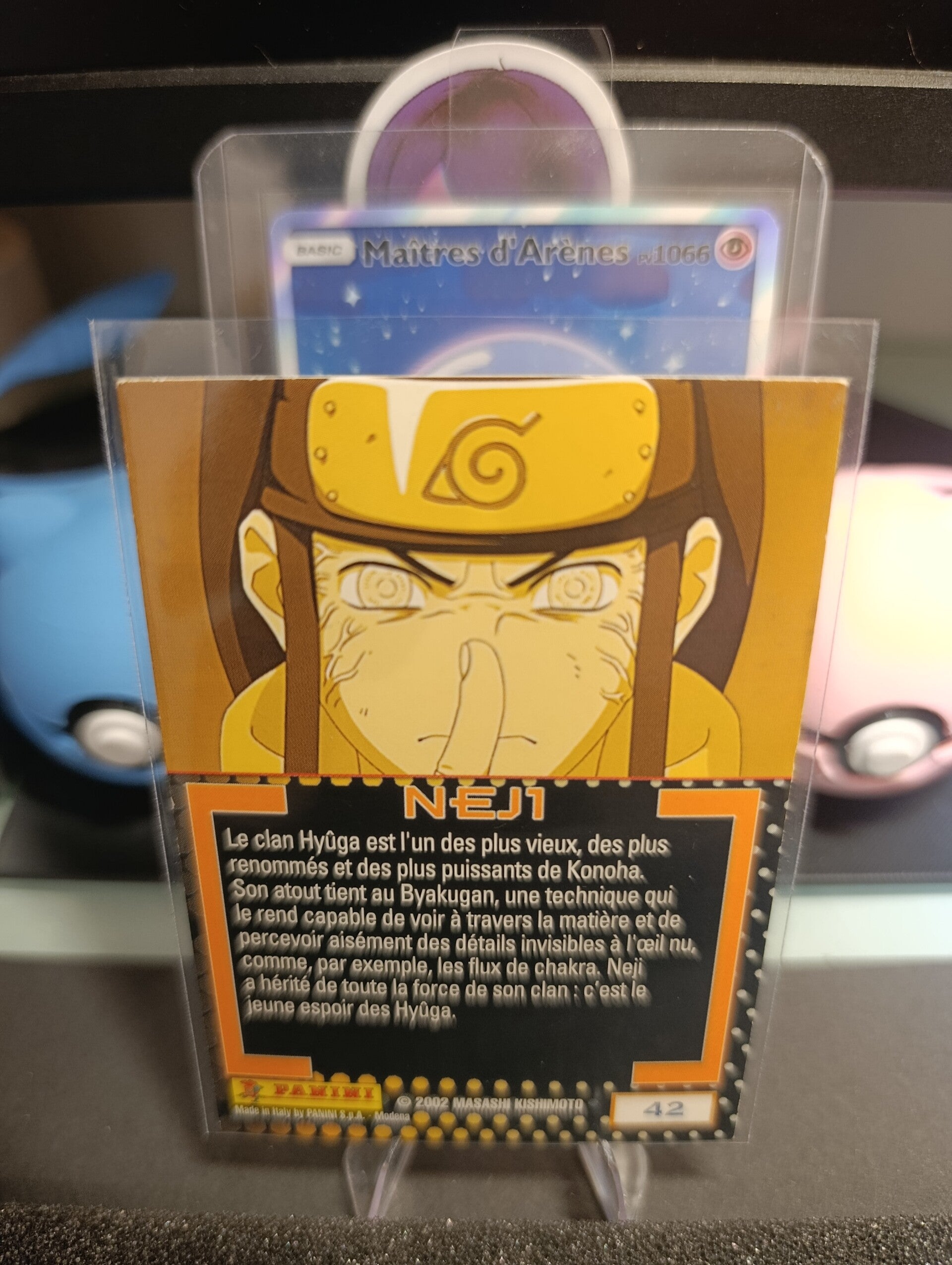Découvrez la carte Neji Hyûga #42, issue de la collection originale Naruto Panini 2002, l’une des premières séries de cartes Naruto éditées et distribuées en France.