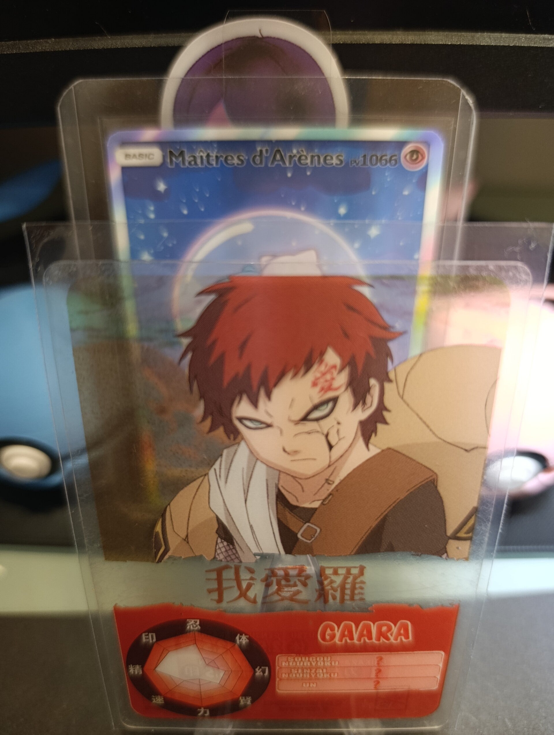 Cette carte met en avant Gaara, le redoutable shinobi du village de Suna, célèbre pour sa maîtrise du sable et son importance dans l’univers Naruto.